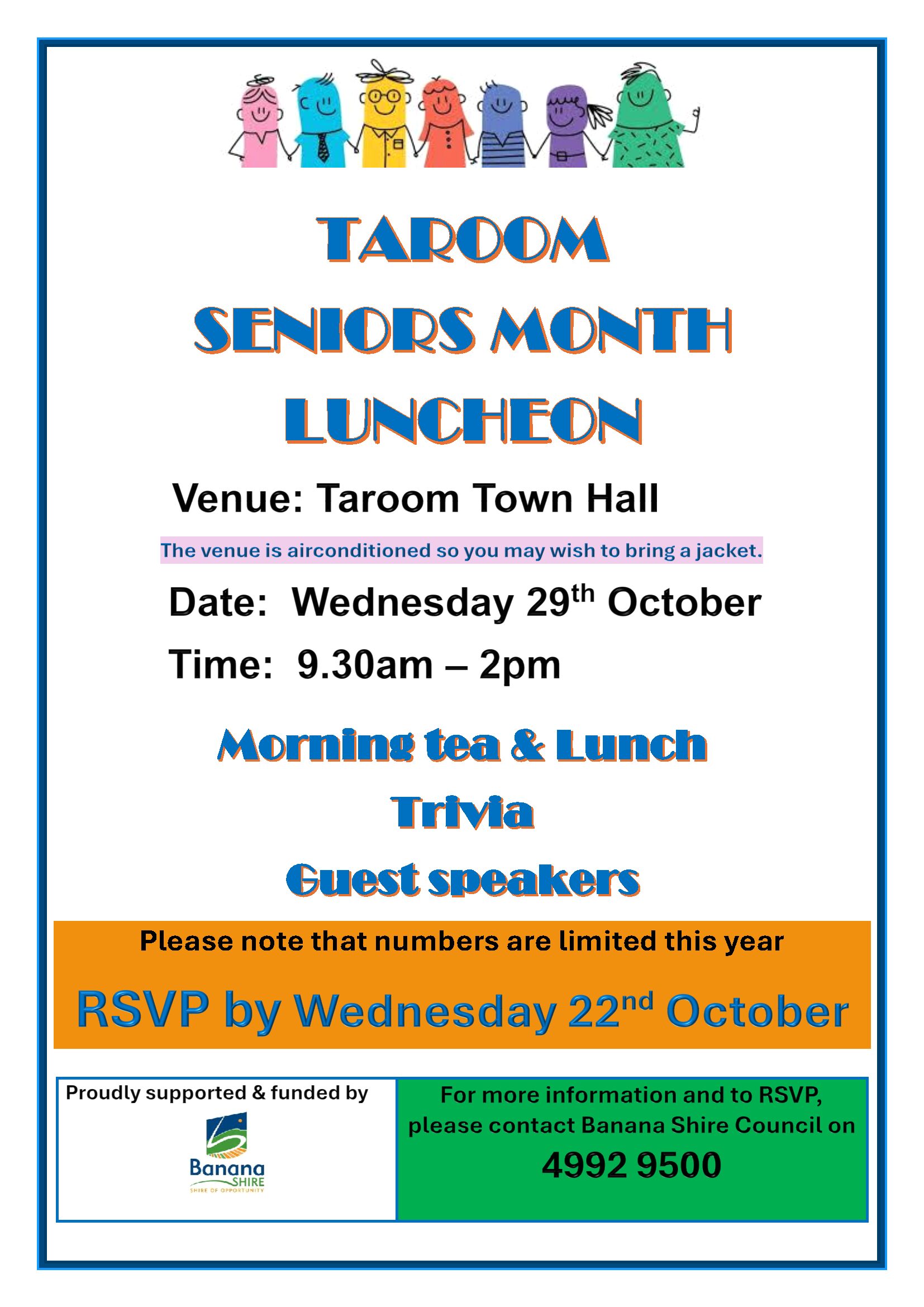Come join us and connect at the Taroom Seniors Month Luncheon Please note, numbers are limited this year so RSVP by Wednesday 22 October 2025 For more information, and to RSVP, please contact Banana Shire Council on 4992 9500