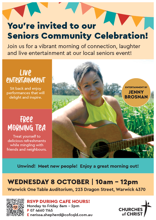 Held at the Churches of Christ Function Centre and Auditorium in Warwick, this event for Seniors Month encourages connection through great music and a high tea style morning tea. Featuring the wonderful talents of singer Jenny Brosnan, this morning is sure to delight both your ears and your tastebuds!