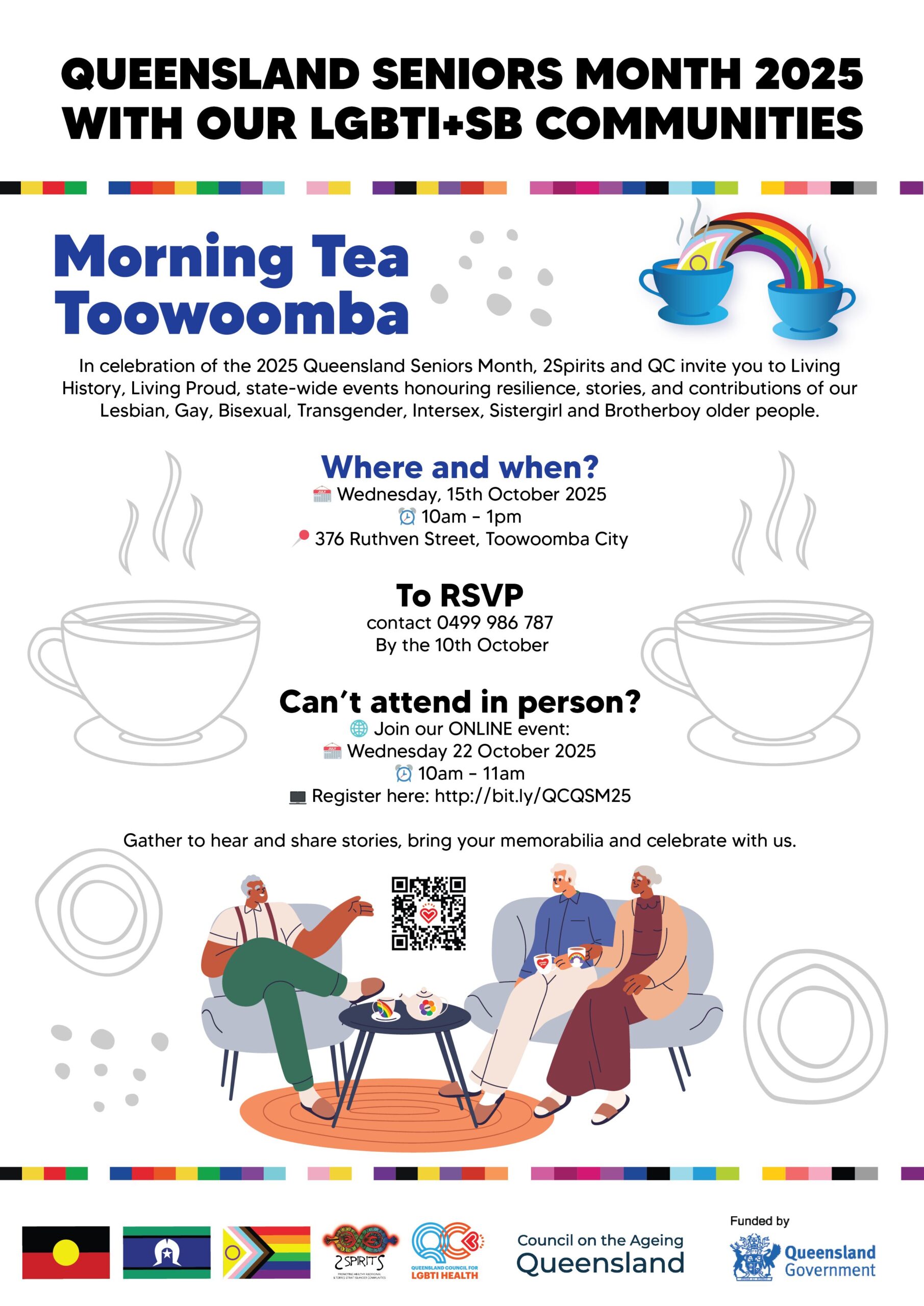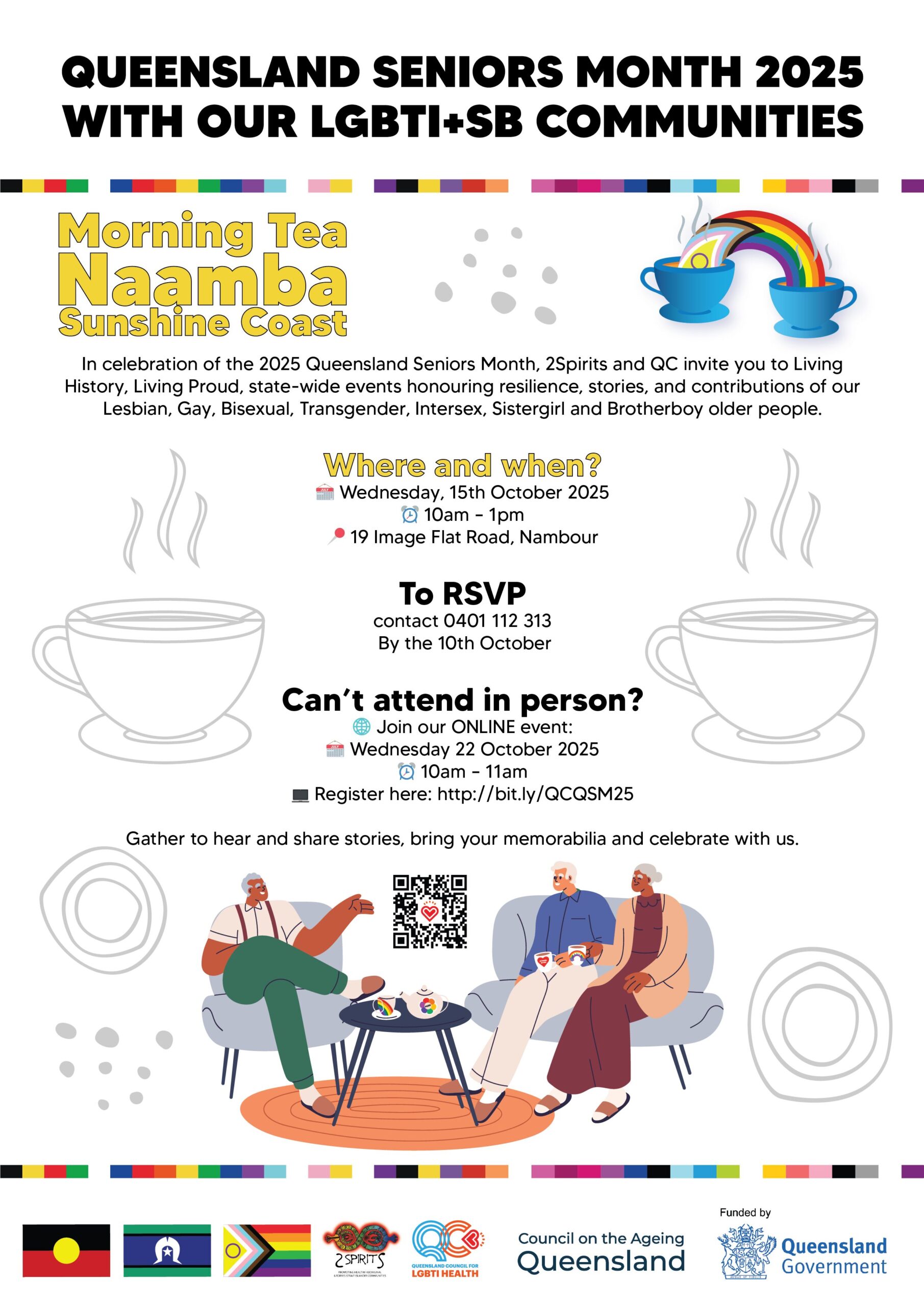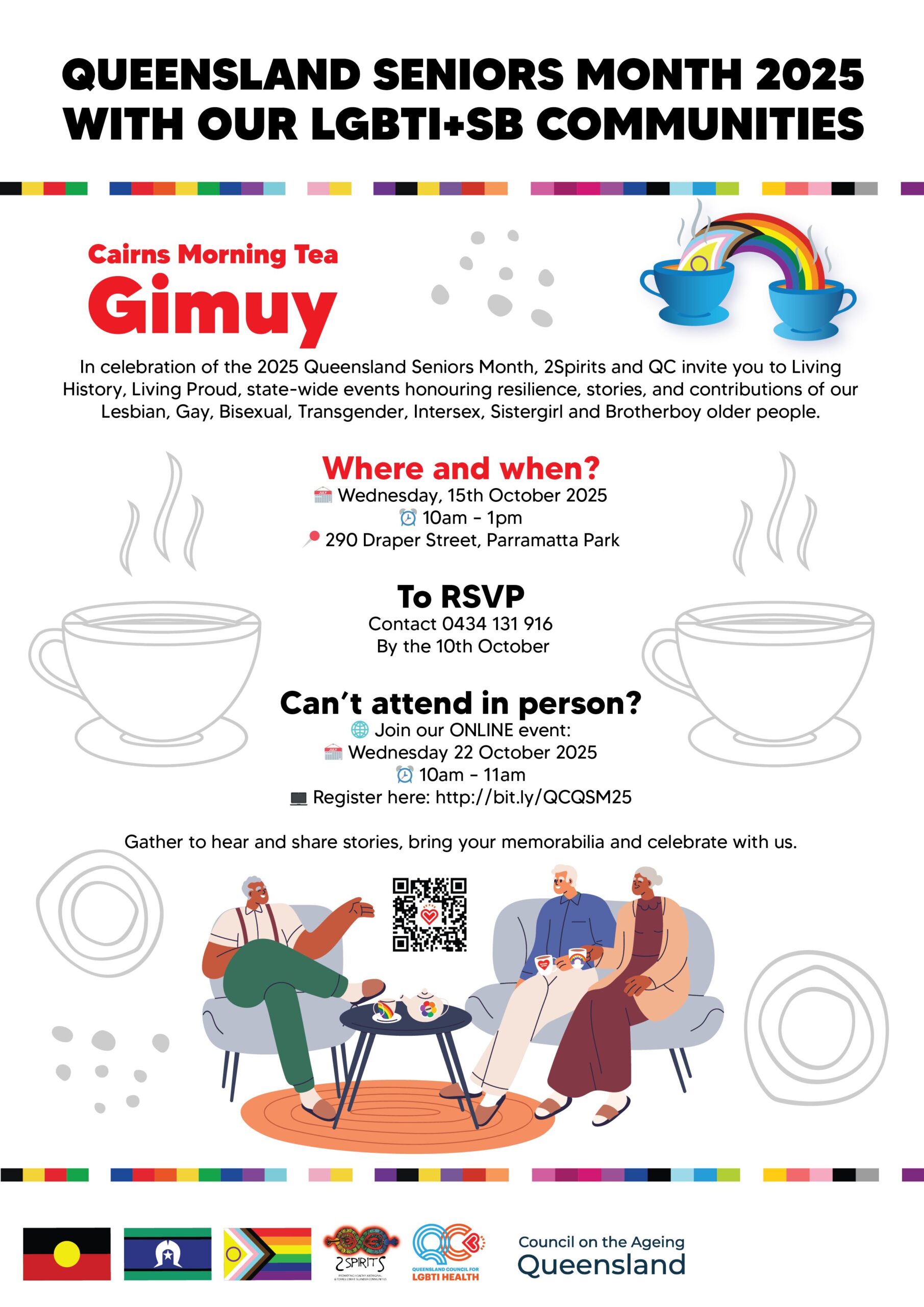 The Aunty Dawn Daylight Room 15a/421 Brunswick St, Fortitude Valley, Brisbane, Queensland, AustraliaPROUD AND LOVING GETTING OLDER IN QUEENSLAND Join us for a FREE gathering with our Lesbian, Gay, Bisexual, Transgender, Intersex, Sistergirl and Brotherboy communities to enjoy light tea, light lunch, and a community art activity to celebrate Queensland Seniors Month. All ages and abilities are welcome! RSVP by 16th October, additional info: https://bit.ly/3ZwditB P: 07