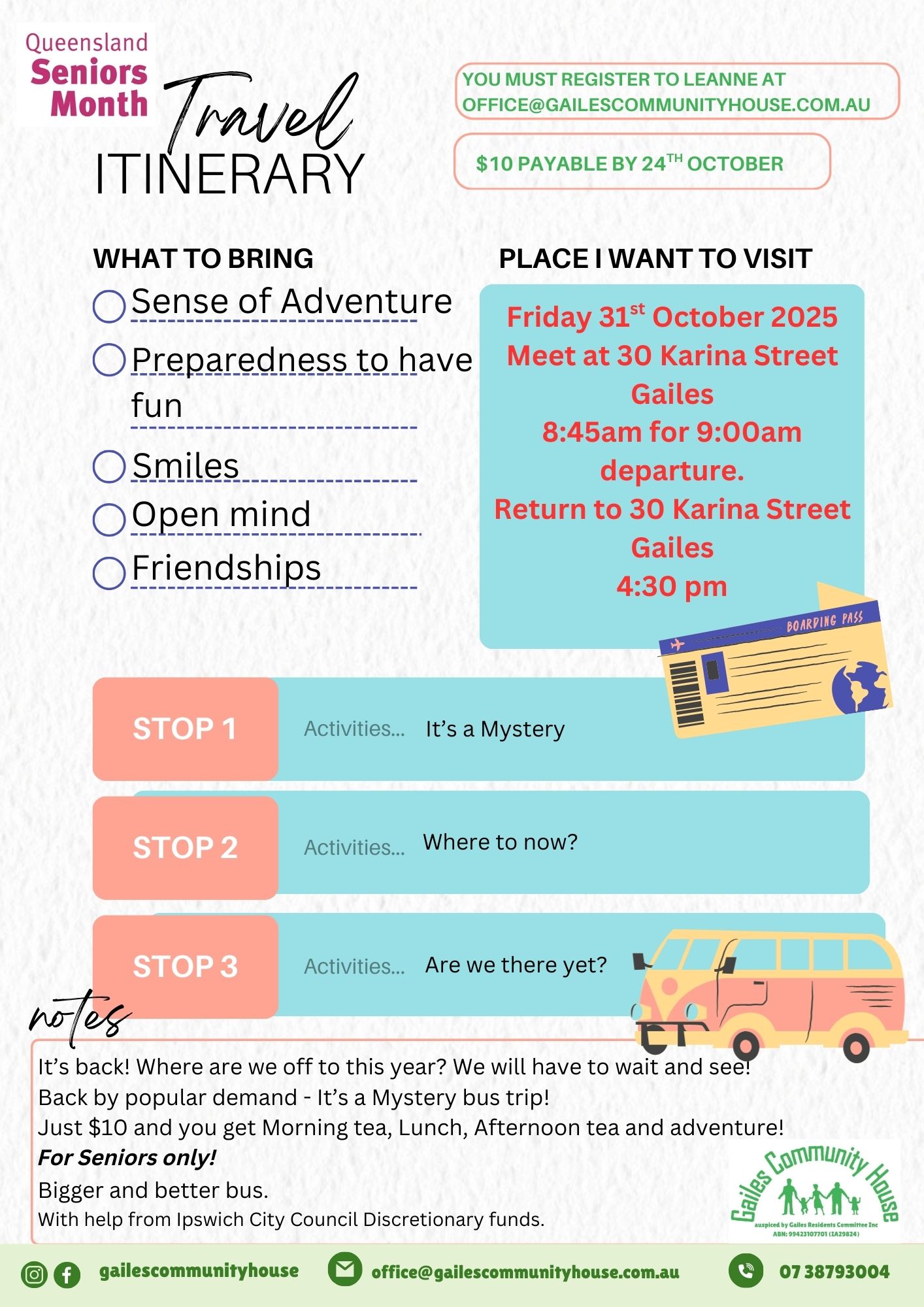 Meeting at Gailes Community House at 8:45am for a 9:00am departure. Aiming to be back at the House at 4pm. There is a $10 fee for this event. Morning tea, Lunch and Afternoon tea is provided (plus extra's in-between) Registration is a must. (Lunch is pre ordered. You will get this information once paid). This