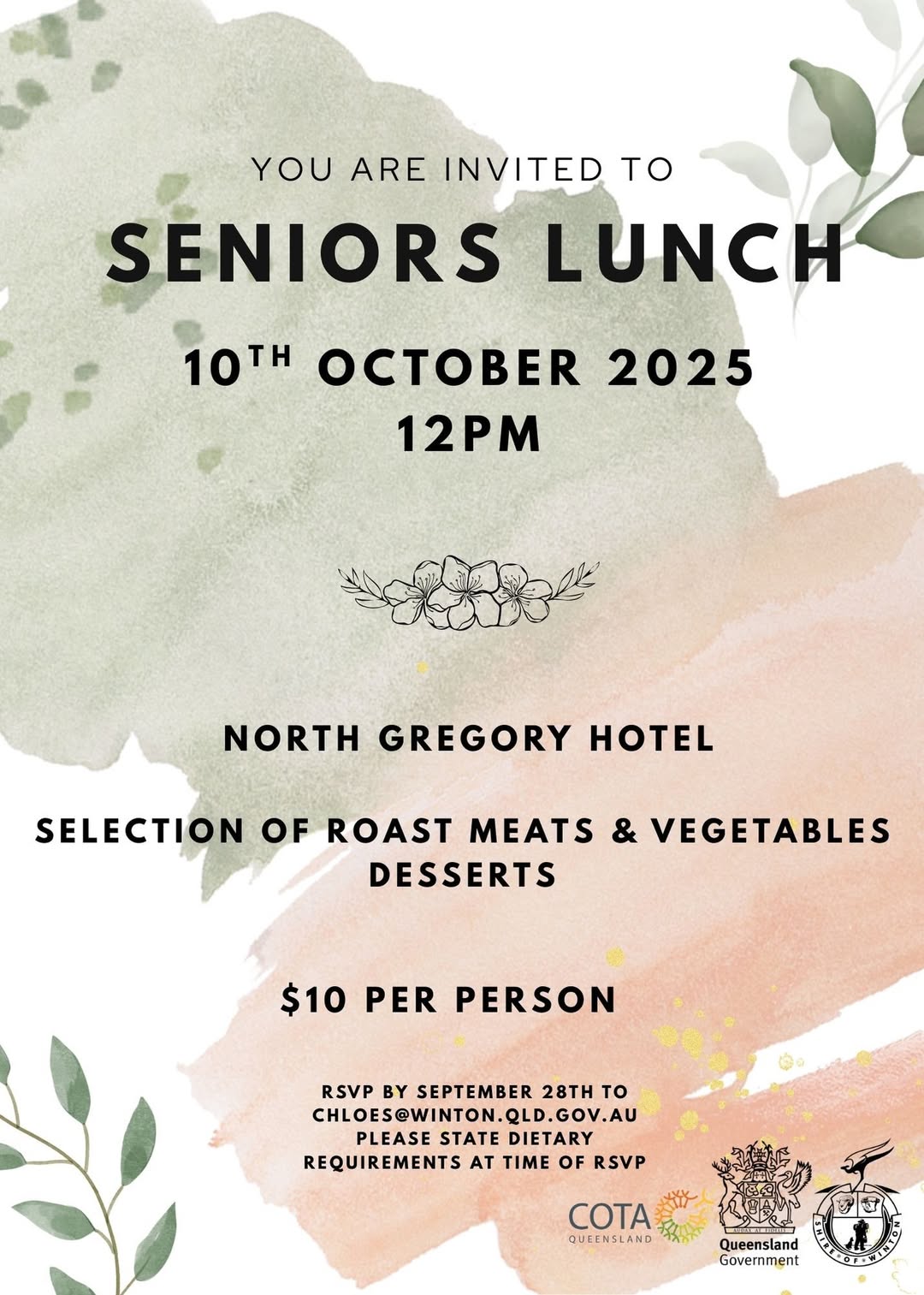 North Gregory Hotel 67 Elderslie Street, Winton, Queensland, Australia𝗦𝗲𝗻𝗶𝗼𝗿𝘀 𝗟𝘂𝗻𝗰𝗵 Friday, 10th October 12:00pm North Gregory Hotel Enjoy a delicious meal with friends Roast Meats Seasonal Vegetables Dessert Only $10 per person Come along for good food and great company! RSVP Chloe Stockham chloes@winton.qld.gov.au